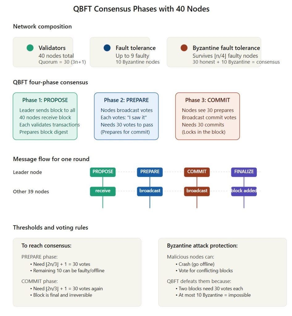 QBFT (Quorum Byzantine Fault Tolerant) consensus is built on the idea that if you have enough honest nodes agreeing on a block, even if some are lying or offline, you can still reach consensus with absolute finality — no rollbacks, no forks.